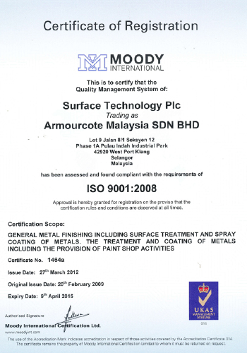 Following a full audit of our quality and environmental processes and standards in February 2009, Moody International awarded Armourcote Malaysia Sdn Bhd with ISO 9001 and ISO 14001 accreditation. You can click the thumbnails on the right to view the certificates.
